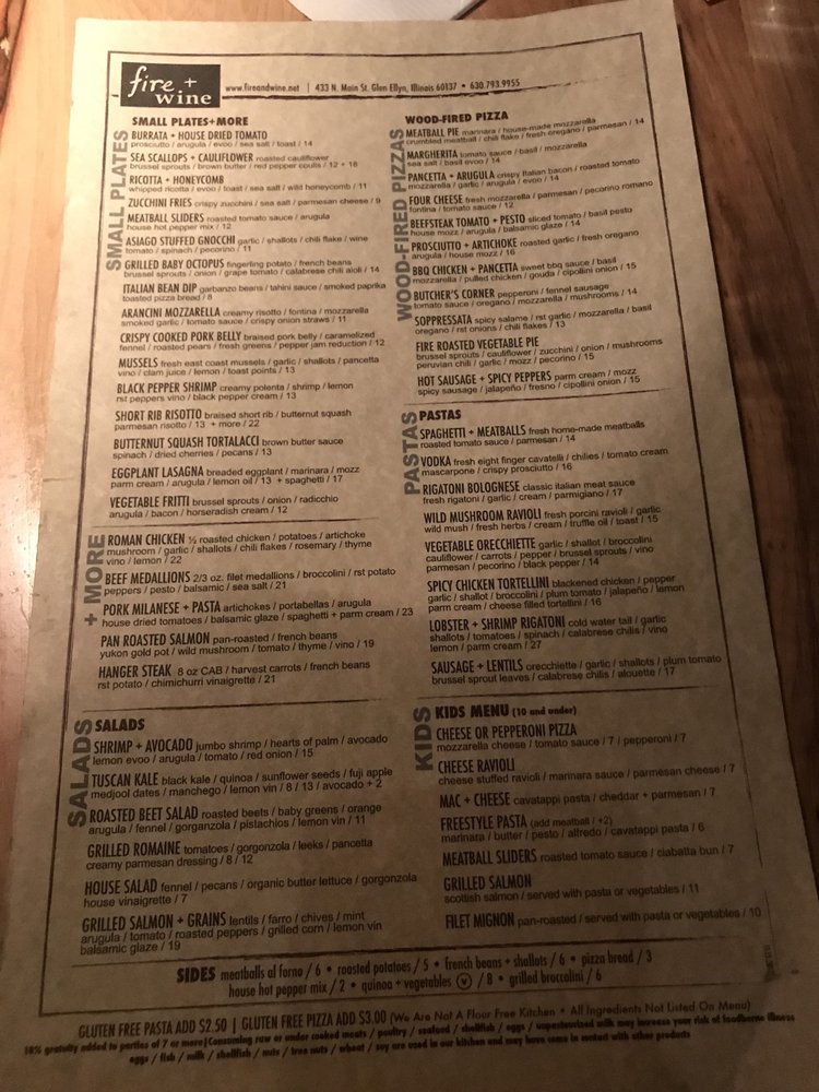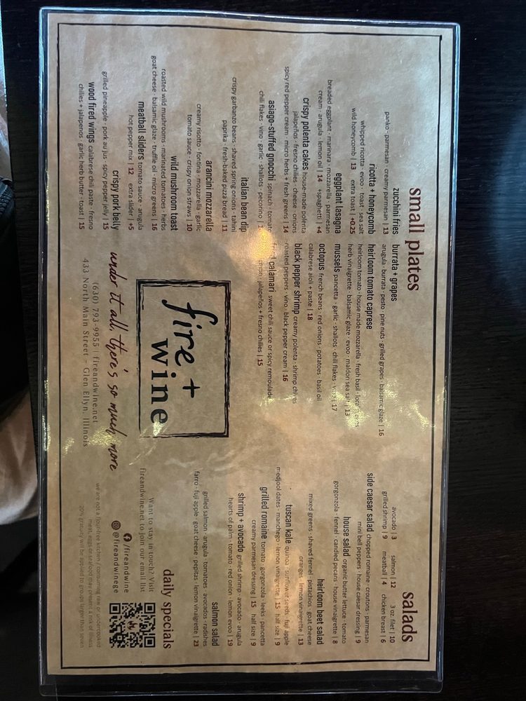 Fire + Wine, located in Glen Ellyn, IL, is a trendy Italian restaurant offering a diverse menu of tapas, small plates, and pizzas. The restaurant is wheelchair accessible, provides outdoor seating, and has a full bar with happy hour specials. The menu includes delicious options like Maryland Style Crab Cake, Ricotta Honeycomb, and Red Wine Braised Short Rib Risotto. Customers rave about the attentive service and tasty dishes, with standout items like Lobster Bisque, Sea Scallops Cauliflower, and Center Cut Filet. The lively atmosphere and variety of vegetarian options make Fire + Wine a must-visit for a memorable dining experience. Don't miss out on their priority seating and special surprises for birthdays to make your visit even more unforgettable.